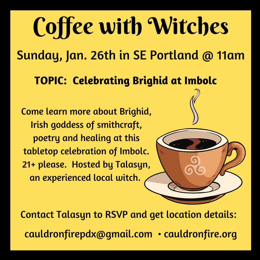 It’s time for our next Coffee with Witches gathering in SE Portland on Sunday, January 26th at 11am. Visit the events page for details. Hope to see you there.