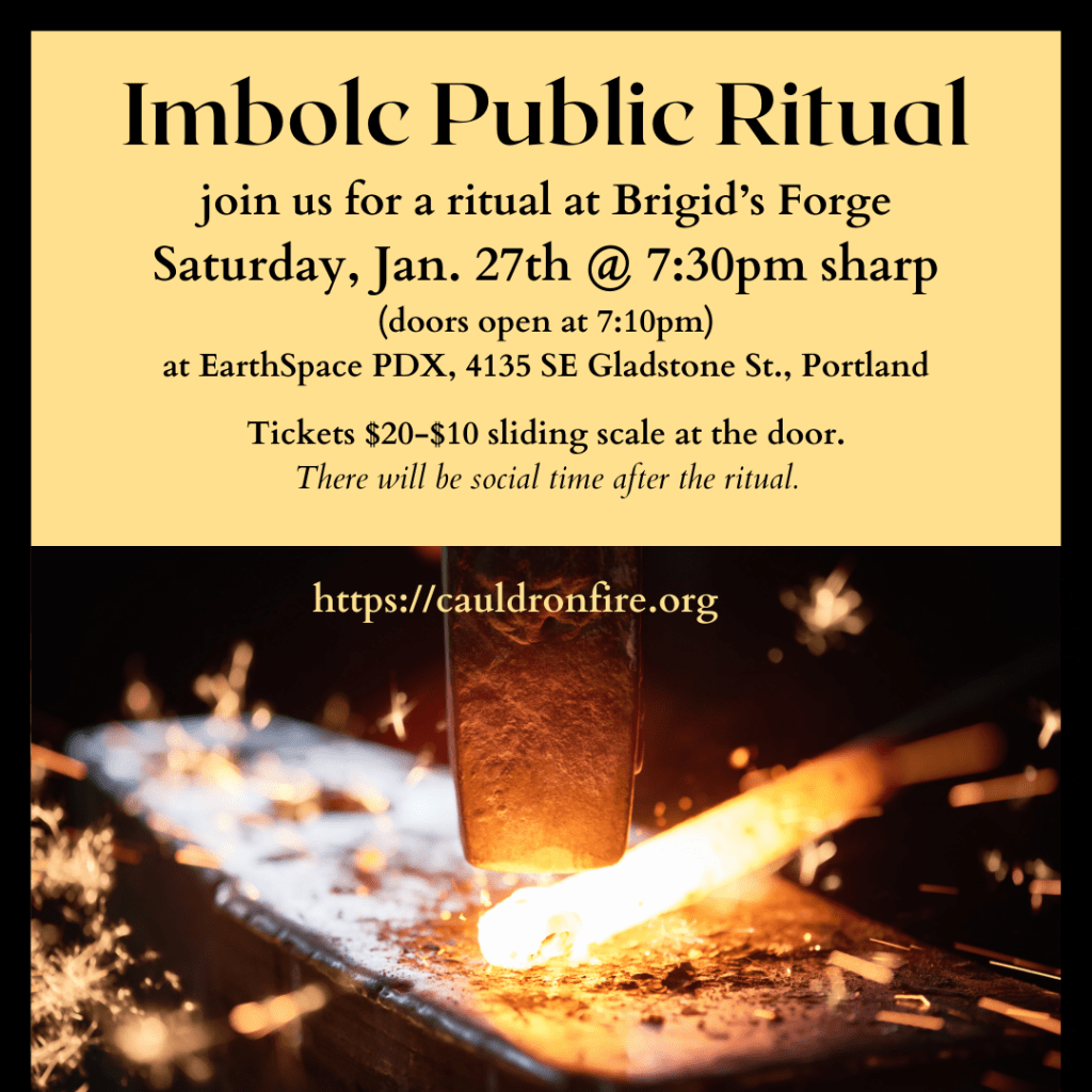 You’re invited to an intimate, friendly Imbolc public ritual on Saturday, January 27th @ 7:30pm sharp. Doors open at 7:10pm. Please be on time, as we won’t admit attendees once the ritual is underway. There will be an optional witchy meet and greet after the ritual until 10pm. Tickets are $20-$10, sliding scale, and are available at the door. No one will be turned away for lack of funds. We openly welcome magical people from the BIPOC and LGBTQIA+ communities. Planning to attend? Please RSVP to cauldronfirepdx@gmail.com to let us know how many people are coming. The space is small and cozy, so your RSVP helps us plan for the group size. We’ll also notify you if there are any weather-related concerns on the day! The ritual will involve a visit to the Irish goddess Brigid’s forge–a place of creativity and transformation in the darkness of midwinter. Come prepared to sing and chant, and help us raise power as an offering to Brigid, and to fuel our hopes and desires.